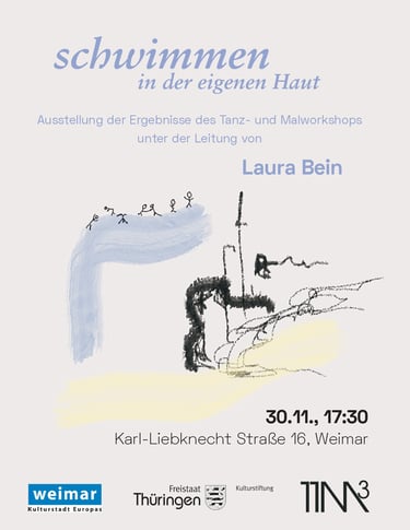 Schwimmen in der eigenen Haut zeigt die Zeichnungen und Malereien verschiedener Teilnehmender eines zweitägigen Tanz- und Kreativworkshops, geleitet von Laura Bein. Der Workshop war offen für alle, die durch Sound, Bewegung, Stift und Pinsel zum Thema Wasser und darüber hinaus geforscht haben, um den eigenen Körper auf eine neue und spielerische Weise kennenzulernen.